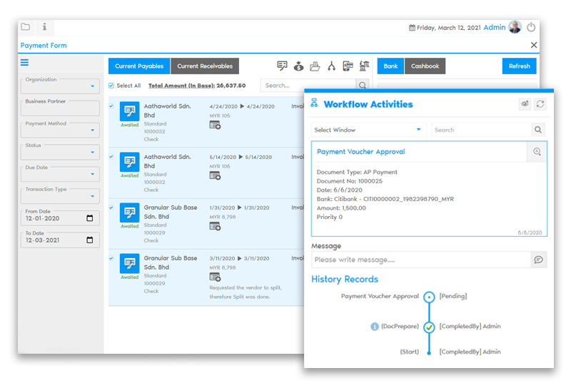 The AR/AP Cockpit provides you with all information that you need and facilitates you with the actions that you need to perform at a single interface. It automates generating payments towards suppliers and takes action on receivables to get paid much quicker.