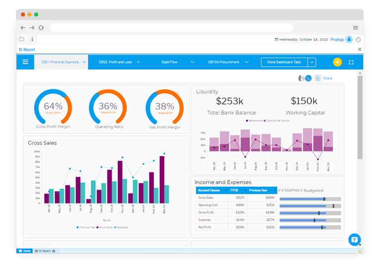 Digging into your data from the highest level to find the reason for changes is much easier with the Financial Management module. Our BI capabilities support your quest to find the “why” and explain the reason in a descriptive way. It lets you compare periods, regions, divisions or any other accounting dimensions.